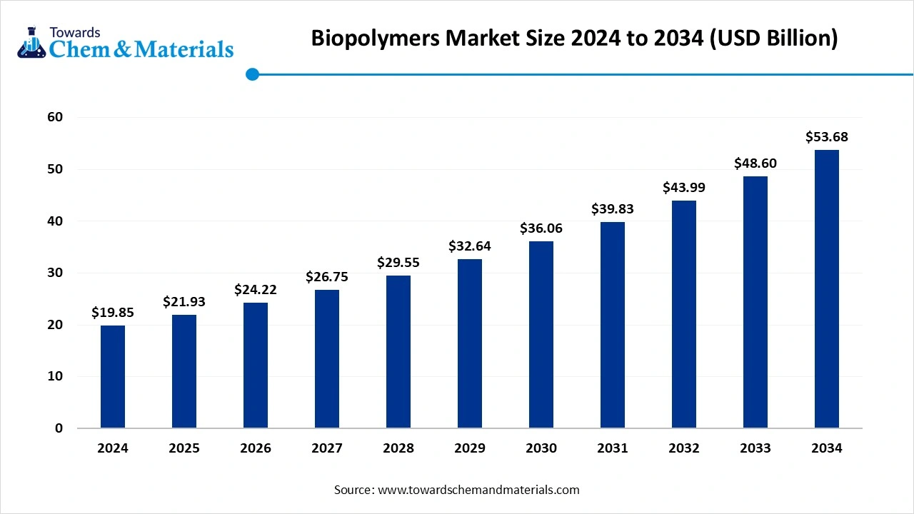 Ottawa, Oct. 09, 2025 (GLOBE NEWSWIRE) -- The global biopolymers market size was valued at USD 19.85 billion in 2024 and is anticipated to reach around USD 53.68 billion by 2034, growing at a compound annual growth rate (CAGR) of 10.46% over the forecast period from 2025 to 2034. A study published by Towards Chemical and Materials a sister firm of Precedence Research.